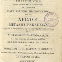 Σπάνια παρτιτούρα βυζαντινής μουσικής. Περιέχει τα Δοξαστικά του ενιαυτού από πρώτης Σεπτεμβρίου μέχρι τέλους Μαρτίου. Σελ. β΄ α΄.α΄ +376, σχήματος 8ου. Στις σελ. α΄ - β΄ "Τοις Φιλομούσοις ομογενέσι", σελ. 1-374 τα δοξαστικά, σελ. 375-376 "Πίναξ των περιεχομένων εορτών εν τω πρώτω τόμω". Πλήρης τίτλος: Δοξαστάριον περιέχον τα Δοξαστικά όλων των δεσποτικών, και Θεομητορικών εορτών, των τε εορταζομένων Αγίων του όλου ενιαυτού, του τε Τριωδίου και Πεντηκοσταρίου / μελοποιηθέν παρά Ιακώβου Πρωτοψάλτου, της του Χριστού Μεγάλης Εκκλησίας · εξηγηθέν δε απαραλλάκτως εις την νέαν της Μουσικής μέθοδον, παρά Χουρμουζίου Χαρτοφύλακος ενός των εφευρετών της ρηθείσης μεθόδου · νυν πρώτον εκδοθέν εις τύπον παρά Θεοδώρου Π.Π. Παράσχου Φωκέως Επιστασία του αυτού · αναλώμασι δε του τε Ιδίου, και των φιλομούσων συνδρομητών. Tόμος πρώτος.