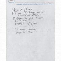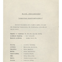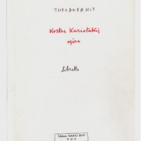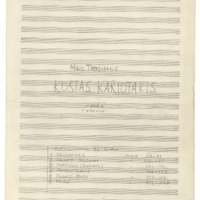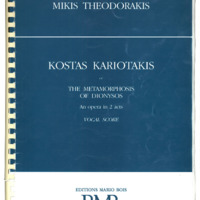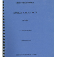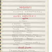 a) sketches, libretto, autograph of short score and marked photocopy Μ.Th. of the first draft of an opera buffa with the title ''Songs on the Amvrakikos Gulf'' b) sketches, notes, fragment of autograph short dcore Μ.Th., sketch of libretto c) sketches of the final form of the opera d) complete autograph of short score Μ.Th. with bars inserted e) photocopy of d) before the changes in the libretto were made f) marked photocopy of d) g) autograph of libretto, typed libretto, in various forms and additional text - prologue Μ.Th. with date 11.12.94. h) printed short score, and two photocopies of printed version: final, one without lyrics and one with corrections Μ.Th. i) autograph score Μ.Th., (see film 4) j) photocopy of i) with minor differences in orchestration. Probably happened before i) was completed k) libretto in French and German and 1 sheet of autograph και 1 Μ.Th. with various changes