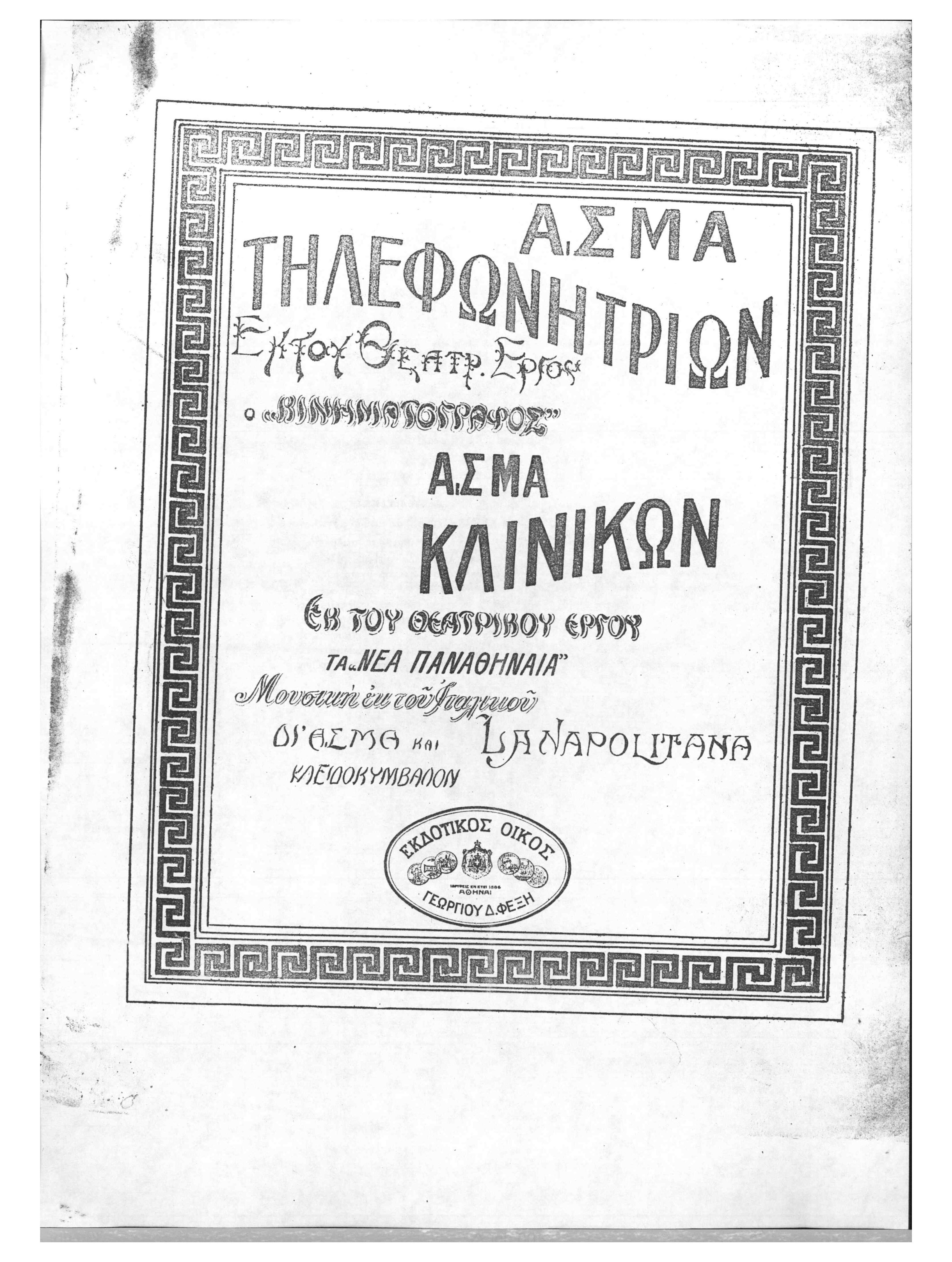 Έκ του θεατρ. έργου ο "Κινηματογράφος". ΄Ασμα κλινικών εκ του θεατρικού έργου τα "Νέα Παναθήναια". Δι` άσμα και κλειδοκύμβαλον. Μουσική εκ του ιταλικού La Napolitana. Διασκευή.