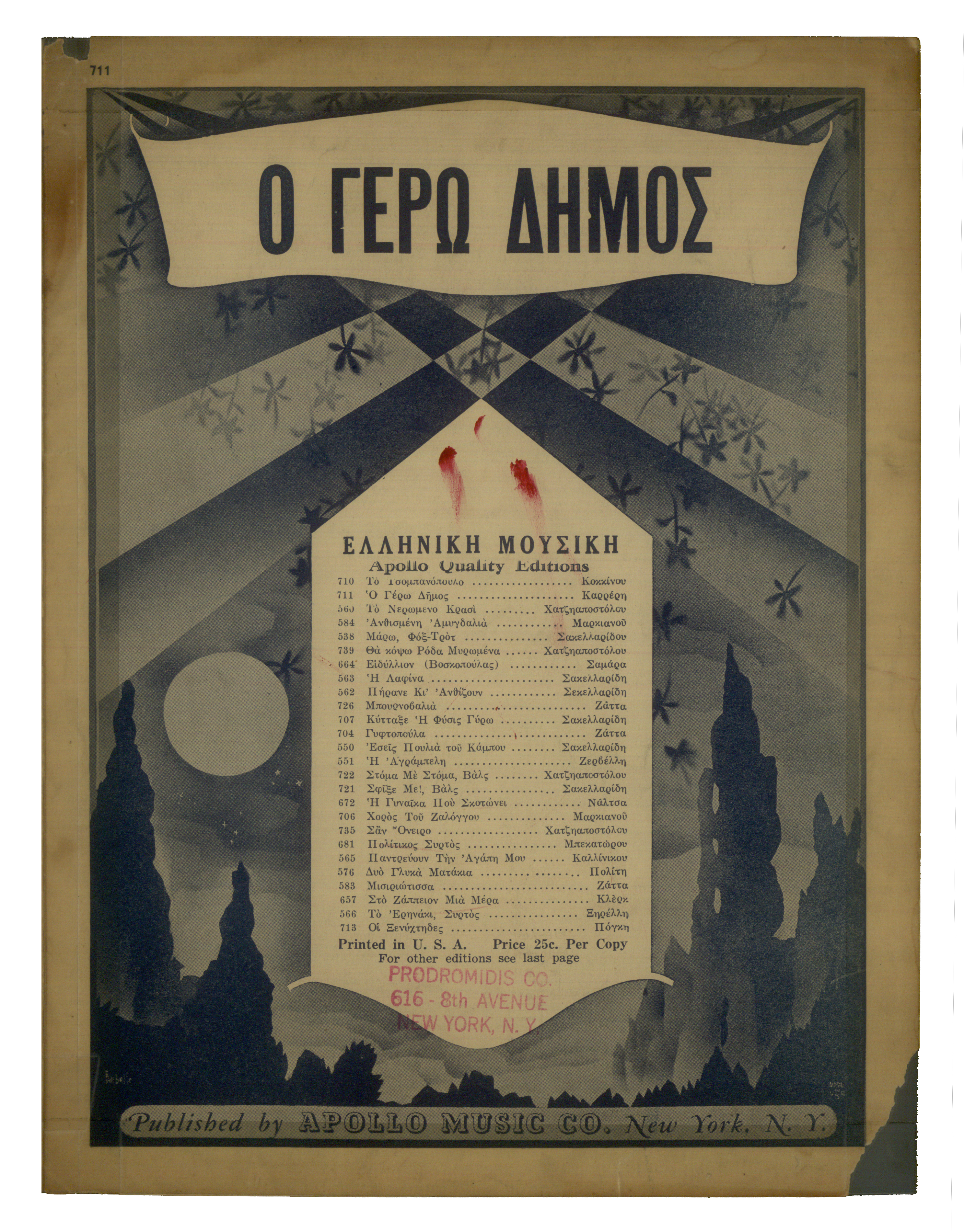 Ελληνική μουσική. Apollo Quality Editions. Prodormidis Co. 616-8th Avenue, New York, N.Y. To Mr. Andrew Karzas.